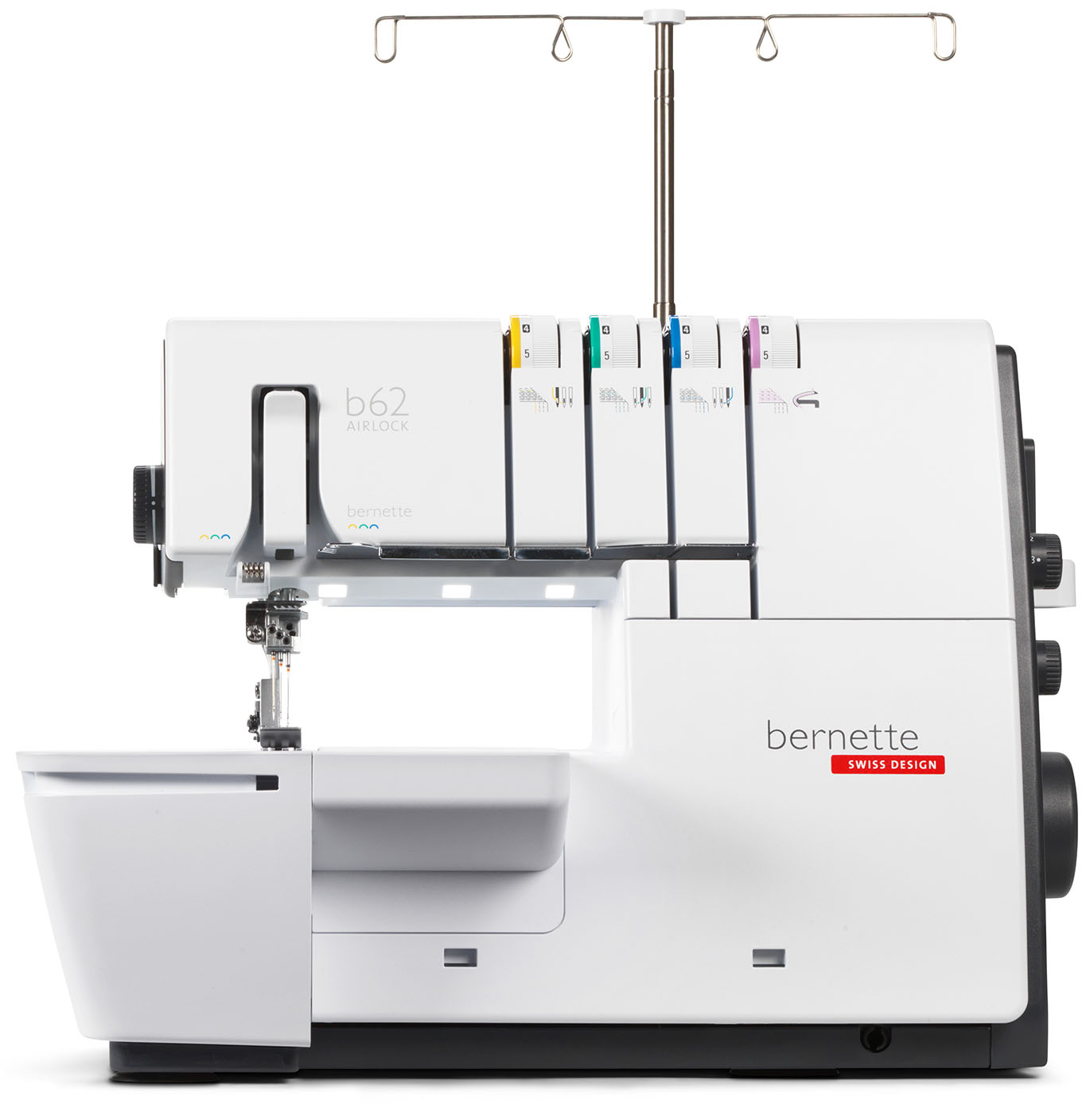 Die bernette 62 AIRLOCK ist die Coverstich-Maschine der bernette 60er Serie. Mit dem automatischen Lufteinfädler wird das Einfädeln des Greiferfadens zum Kinderspiel. Die Maschine verfügt mit 4 Coverstichen und 3 Kettenstichen über unzählige Anwendungsmöglichkeiten, mit welchen insbesondere dehnbare Stoffe perfekt verarbeitet werden. Der Nähfuss lässt sich mit dem Kniehebel senken und temporär anheben, so dass beide Hände zum Führen des Stoffes frei bleiben. Der Anschiebetisch und der dazu passende Coverstich-Einsatz vergrössern die Nähfläche und bieten ausreichend Platz für grosse Projekte. Dank der 5 LEDs wird der grosse Arbeitsbereich optimal ausgeleuchtet.