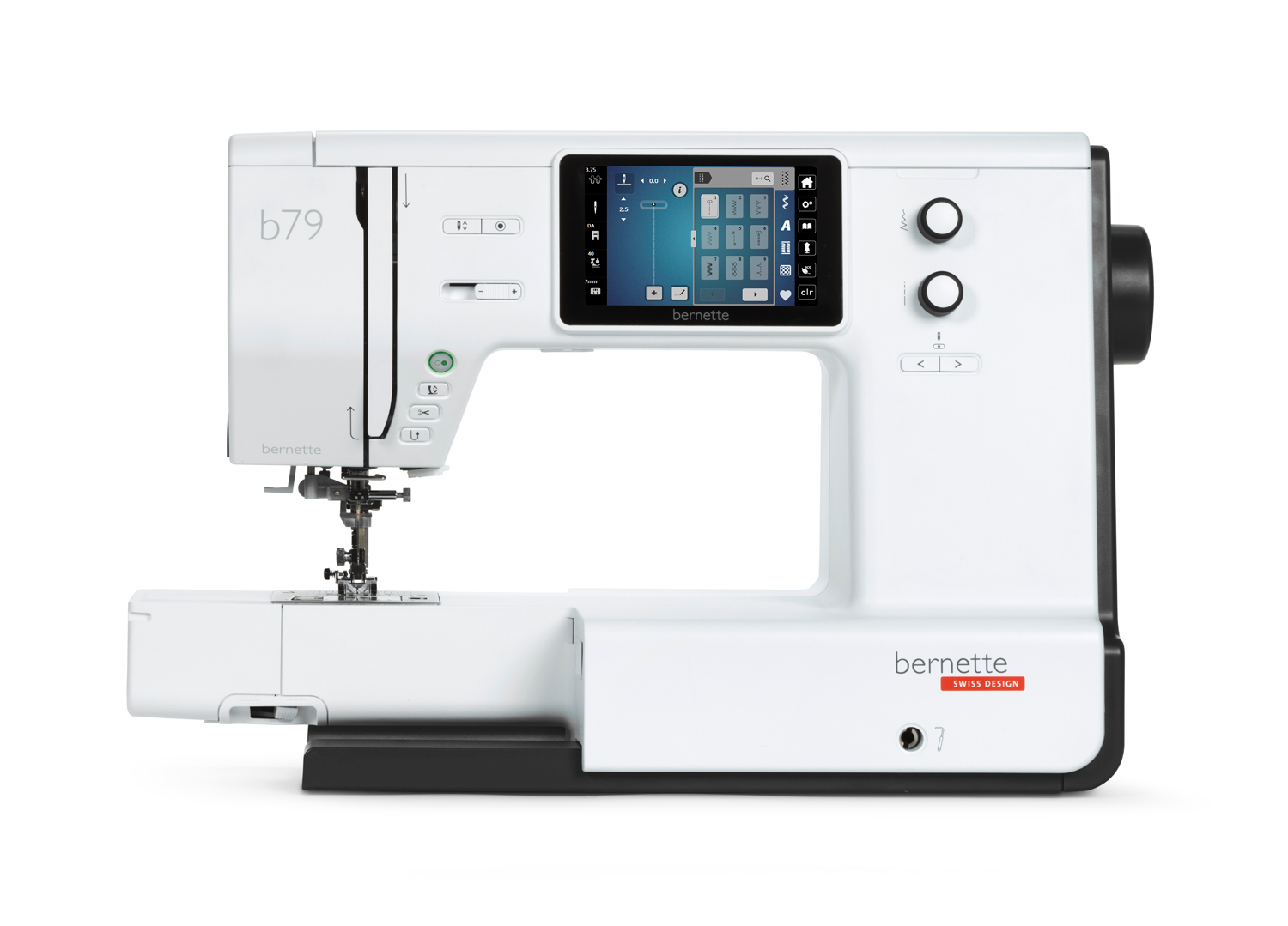 Rechts neben der Nadel hat die bernette 77 mit 230 mm viel Platz für deine kreativen Projekte. Vier LEDs leuchten den Nähbereich hell aus. Insgesamt stehen 500 Stiche zur Auswahl, darunter 22 Nutzstiche, 133 Zierstiche, 3 Alphabete, 35 Quiltstiche und 17 Knopflöcher. Die maximale Stichbreite beträgt 7 mm und die maximale Stichlänge 5 mm. Neben praktischen Funktionen wie dem Geschwindigkeitsregler und dem Nadelstopp oben/unten bietet die b77 auch einen Nadeleinfädler sowie einen automatischen Fadenabschneider. Im Lieferumfang sind acht Nähsohlen und ein grosser Anschiebetisch enthalten.
