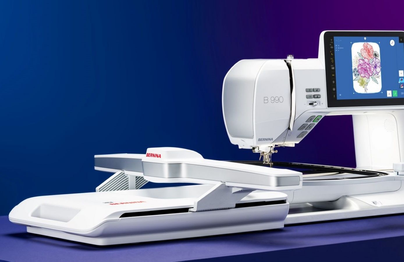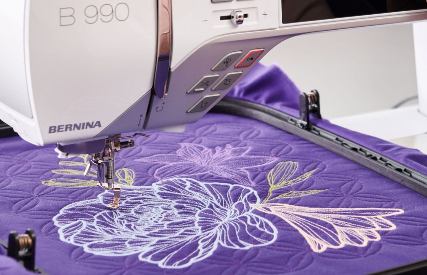 Die BERNINA 990 ist die ultimative All-in-One-Nähmaschine. Extra viel Platz für grosse Näharbeiten und gigantische Stickereien. Müheloses Quilten selbst bei den grössten Quilts.