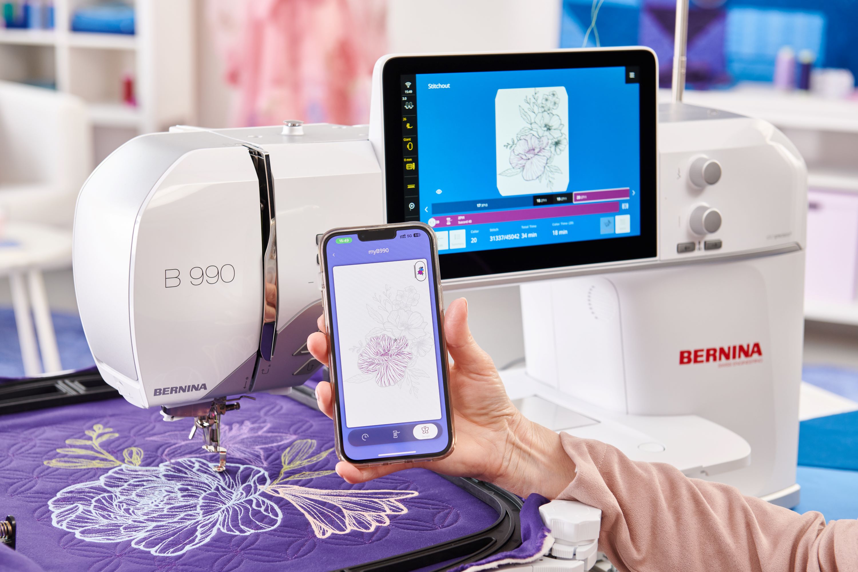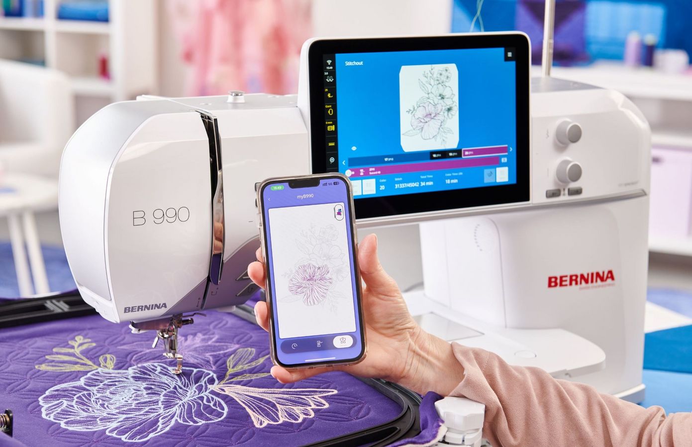 Da die BERNINA 990 WiFi-fähig ist, können Sie Motive aus der BERNINA Sticksoftware direkt auf die Maschine übertragen. Und mit der BERNINA Stitchout App kann der Stickvorgang aus der Ferne überwacht werden.