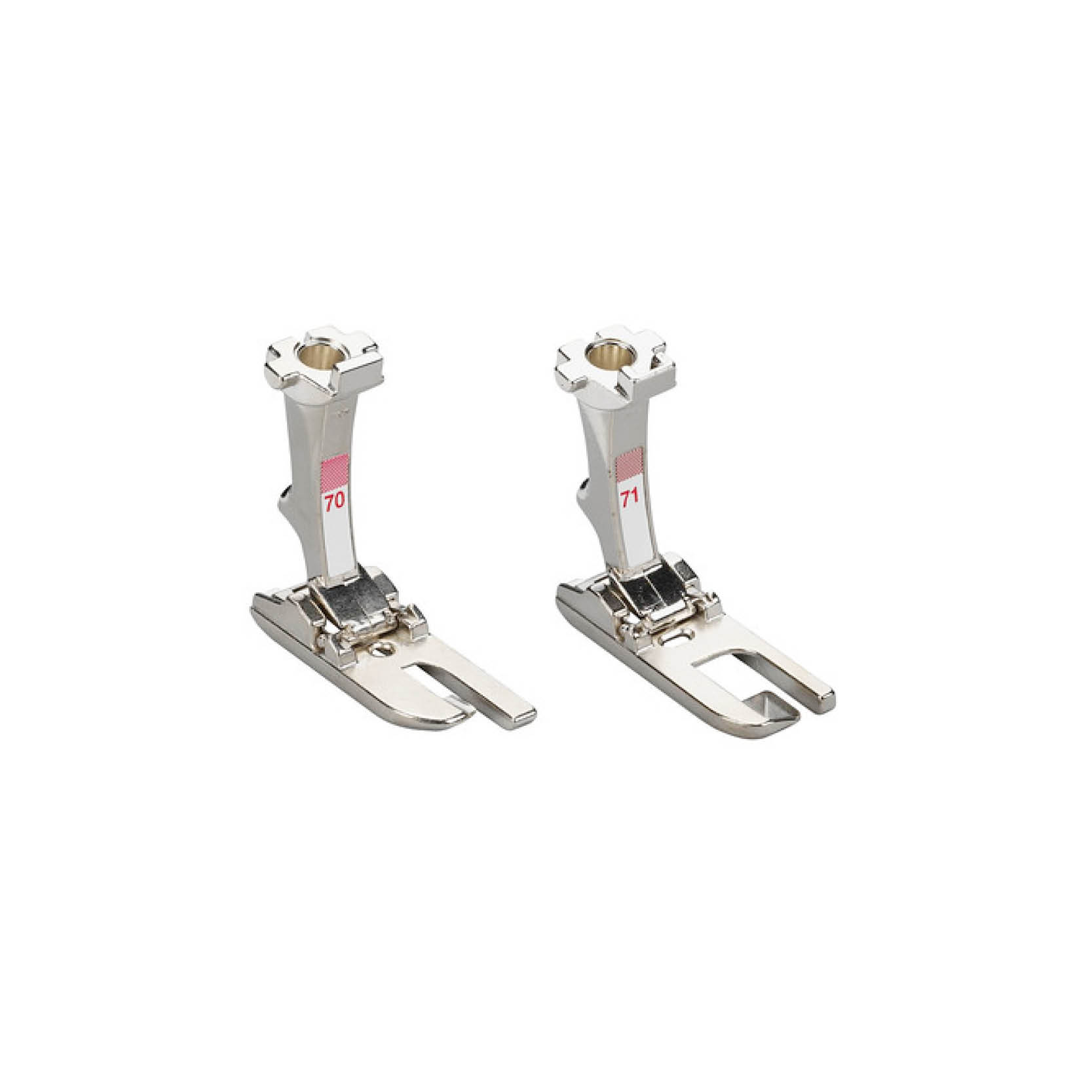Mit ihm lassen sich exakte Kappnähte anfertigen. Da beide Nahtzugaben in die Saumnaht eingeschlossen und festge- steppt werden, eignen sie sich auch für beidseitig tragbare Bekleidung. Der Fuss # 70 ist für Kappnähte bis 3 mm Breite und der Fuss # 71 für Kappnähte bis 6 mm Breite geeignet.