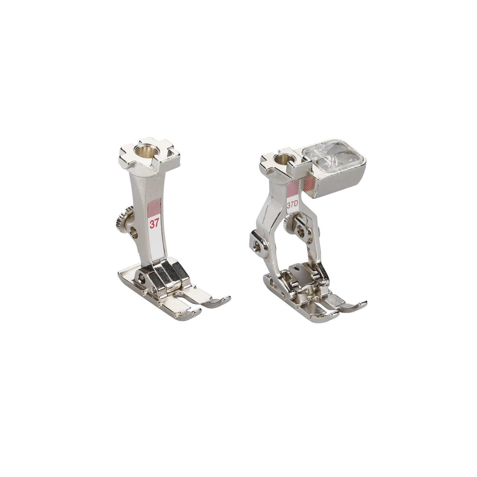 Der Fuss ist hervorragend für Patchworkarbeiten mit 3 mm (1⁄8 inch) oder 6 mm (1⁄4 inch) Nahtzugaben geeignet. Die drei seitlich angebrachten Kerben bieten eine genaue Orientierung für das Einsetzen winkeliger Patchworkteile.