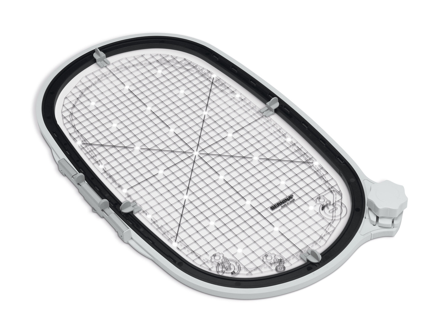 Stickrahmen für grossflächige Stickprojekte. Mit diesem Bernina Stickrahmen können mehrere Motive ideal kombiniert werden. Er verfügt über einen grossen Drehverschluss mit Ratschenmechanismus zum einfachen Ein- und Ausspannen des Stickmaterials. Die mitgelieferte Schablone dient als Platzierungshilfe.