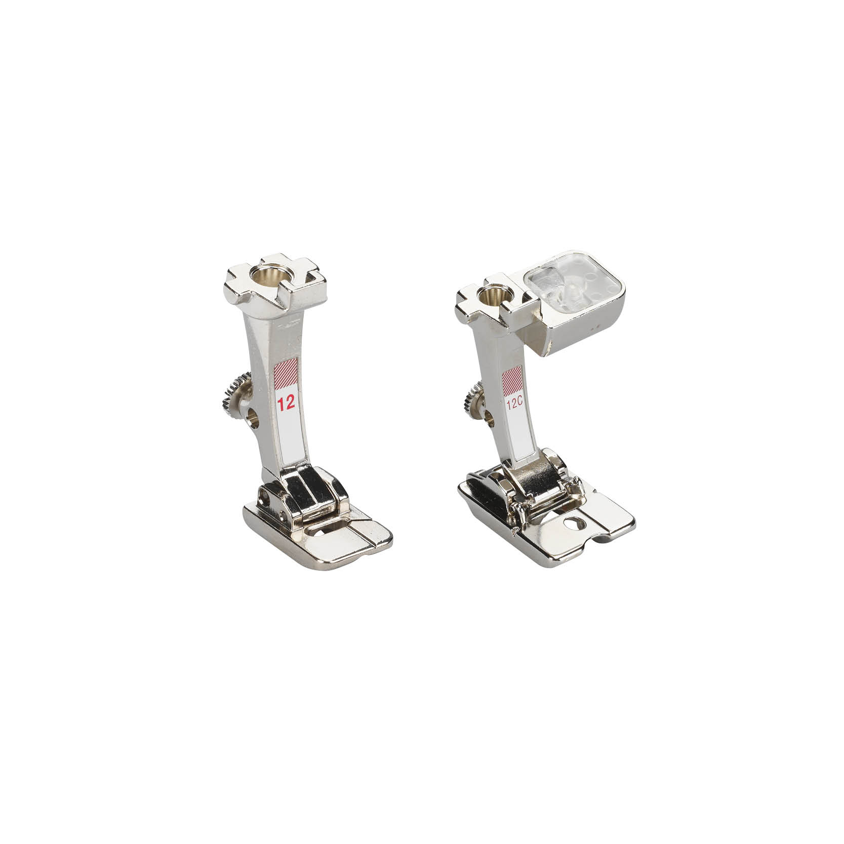Zum Zusammennähen von Strickwaren, Aufnähen von dicken Kordeln, Perlenschnüren und Pailletten oder zum Herstellen und Einnähen von Paspeln im gleichen Arbeitsgang. Der Fuss # 12C mit einer maximalen Stichbreite von 9 mm hat ein zusätzliches Führungsloch zum Übernähen von Beilaufgarnen wie Wolle, Garnen und Lederstreifen.