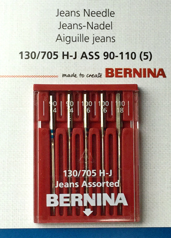 Sortiment mit 5 Jeansnadeln der Stärke 90, 100 und 110. Diese Jeansnadeln sind im Vergleich zu einer Universalnadel etwas dicker/stärker. Zudem ist die Spitze sehr schlank gehalten, damit die Nadel festes Gewebe leichter durchstechen kann. Das gut sortierte Set beinhaltet Nadeln für unterschiedlich dicke Fäden: Nadelstärke 90 (für Nähfaden), Nadelstärke 100 (für Jeansfaden) und Nadelstärke 110 (für Cordonnet).